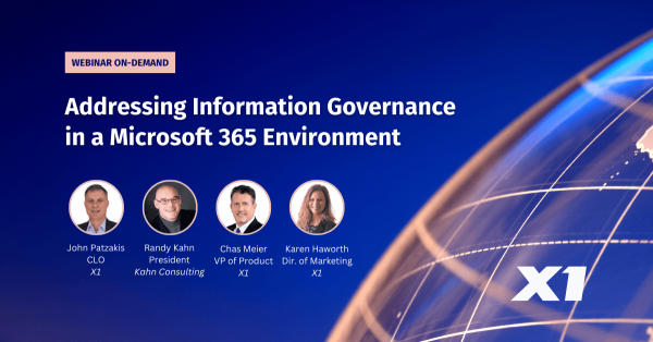 Last week X1 hosted a webinar with industry leaders Randy Kahn and Chas Meier to discuss information governance challenges in an M365 environment. Kahn outlined information governance principles and priorities in general and then emphasized how technical automation is essential to enforce and execute on any implemented information governance policies and procedures.